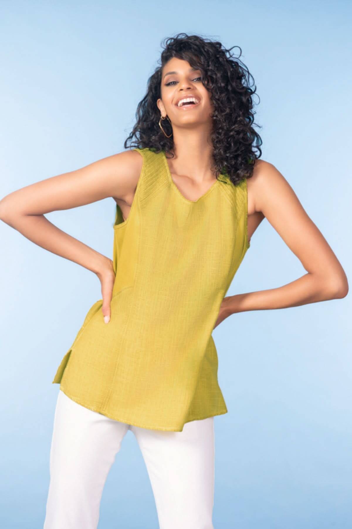 Description : Ce haut sans manches séduit par sa silhouette épurée et sa coupe fluide, idéale pour une allure soignée au quotidien. Son encolure arrondie met délicatement en valeur le port de tête, tandis que la matière légère assure un tombé naturel et confortable. Facile à intégrer à une tenue de travail comme à un look plus décontracté, il se porte seul ou sous une veste pour une polyvalence maximale.