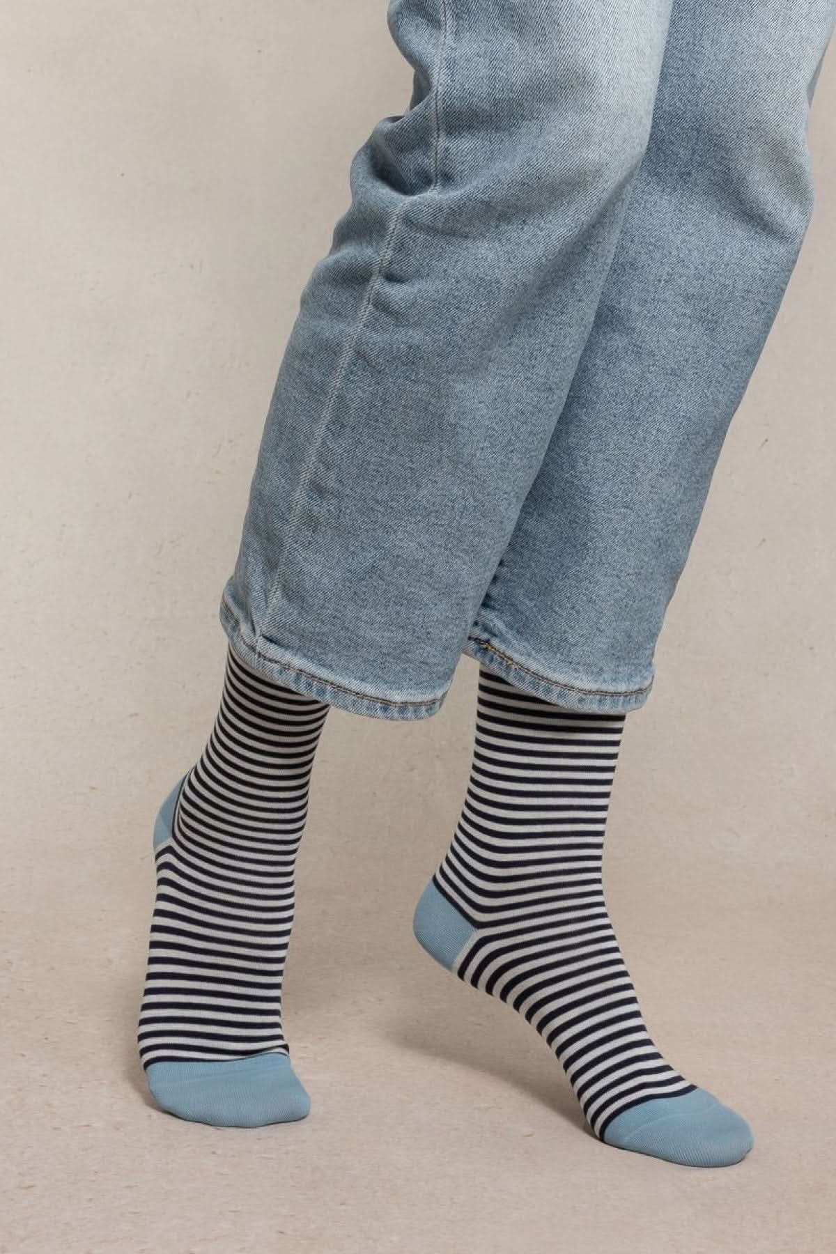 Chaussettes à rayures fines bleues avec pointe, talon et bord côtelé contrastés, maille douce et respirante pour confort quotidien.