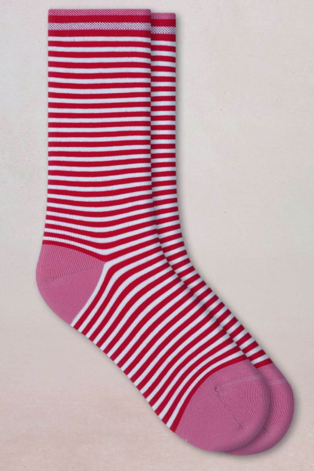 Chaussettes à rayures fines rouges et blanches avec pointe et talon contrastés, portées pour un look moderne et élégant.