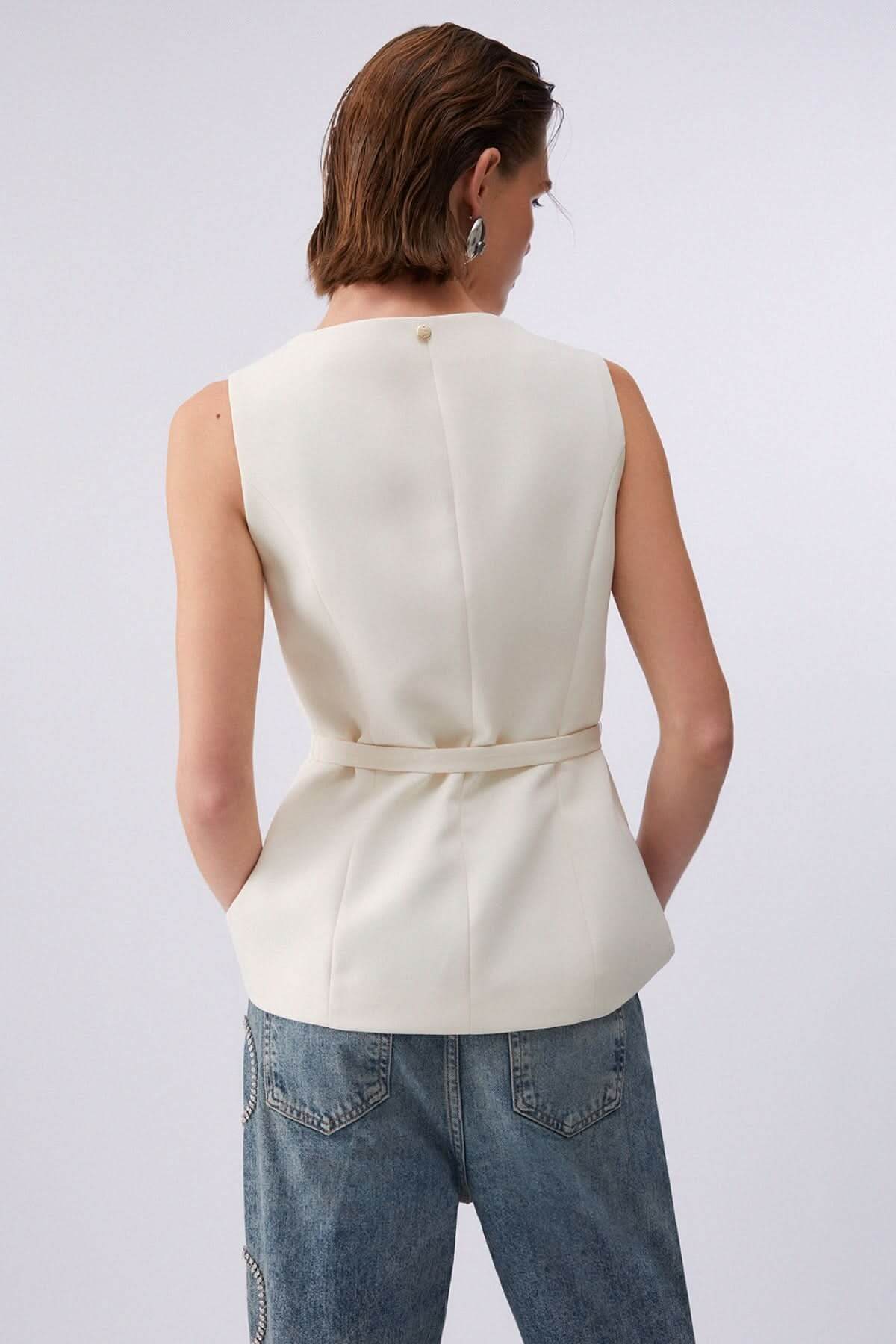 Cette veste sans manches propose une silhouette structurée et élégante. Sa ceinture ajustable souligne la taille et apporte une touche raffinée à l’ensemble. Facile à superposer, elle complète parfaitement une tenue moderne et sophistiquée.