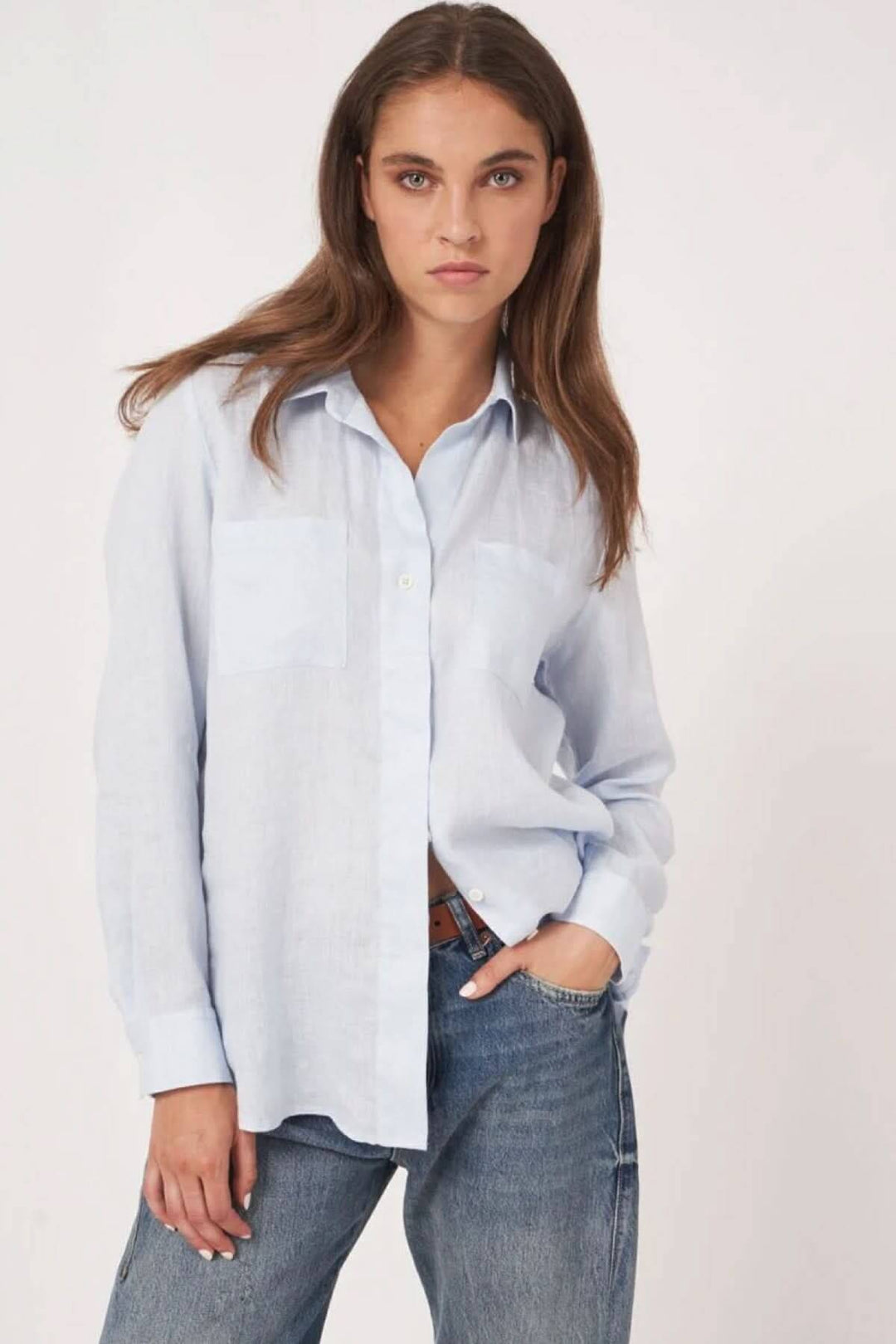 Blouse en lin fluide à manches longues et col classique, offrant un look décontracté et intemporel pour femmes, portée avec un jean casual.
