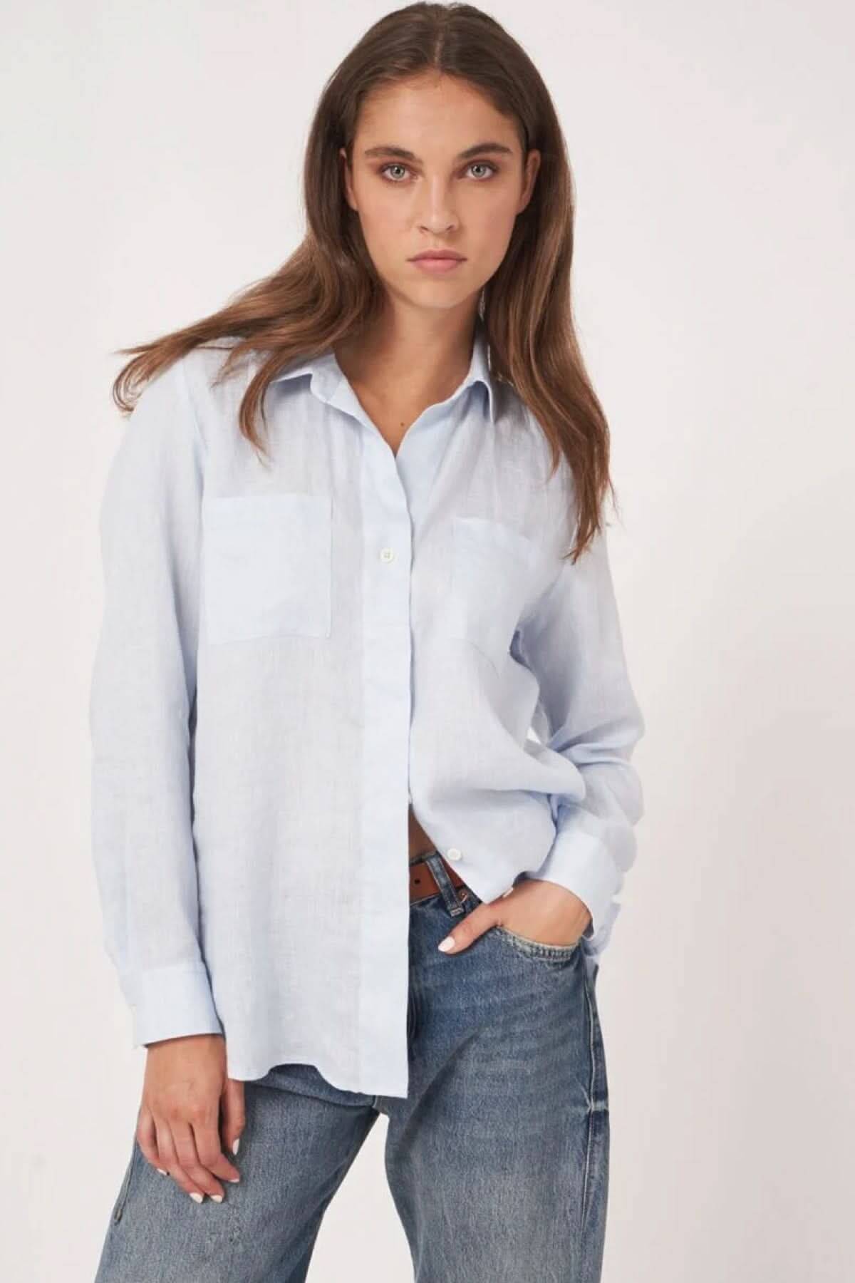 Blouse en lin fluide avec coupe droite, col classique et manches longues pour un style décontracté et intemporel.