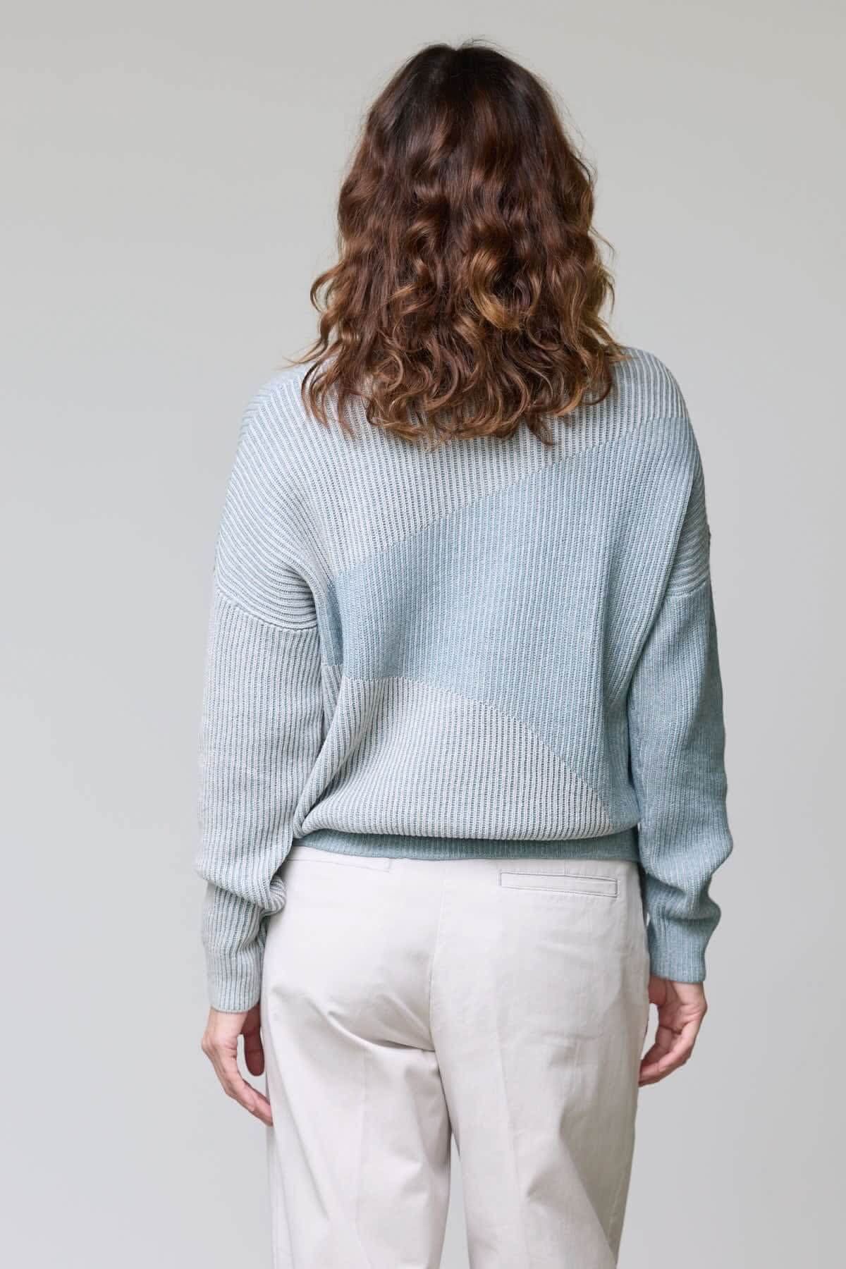 Femme portant un chandail en tricot côtelé bleu avec coupe décontractée et finition raffinée. Tissu léger et respirant, style moderne.