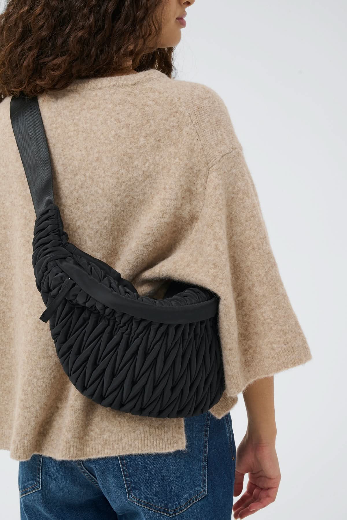 Description: This crossbody bag stands out for its modern design and quilted, gathered texture, which adds dimension to its silhouette. Its ergonomic shape hugs the body for comfortable everyday wear. Practical and stylish, it effortlessly complements an urban or casual outfit.