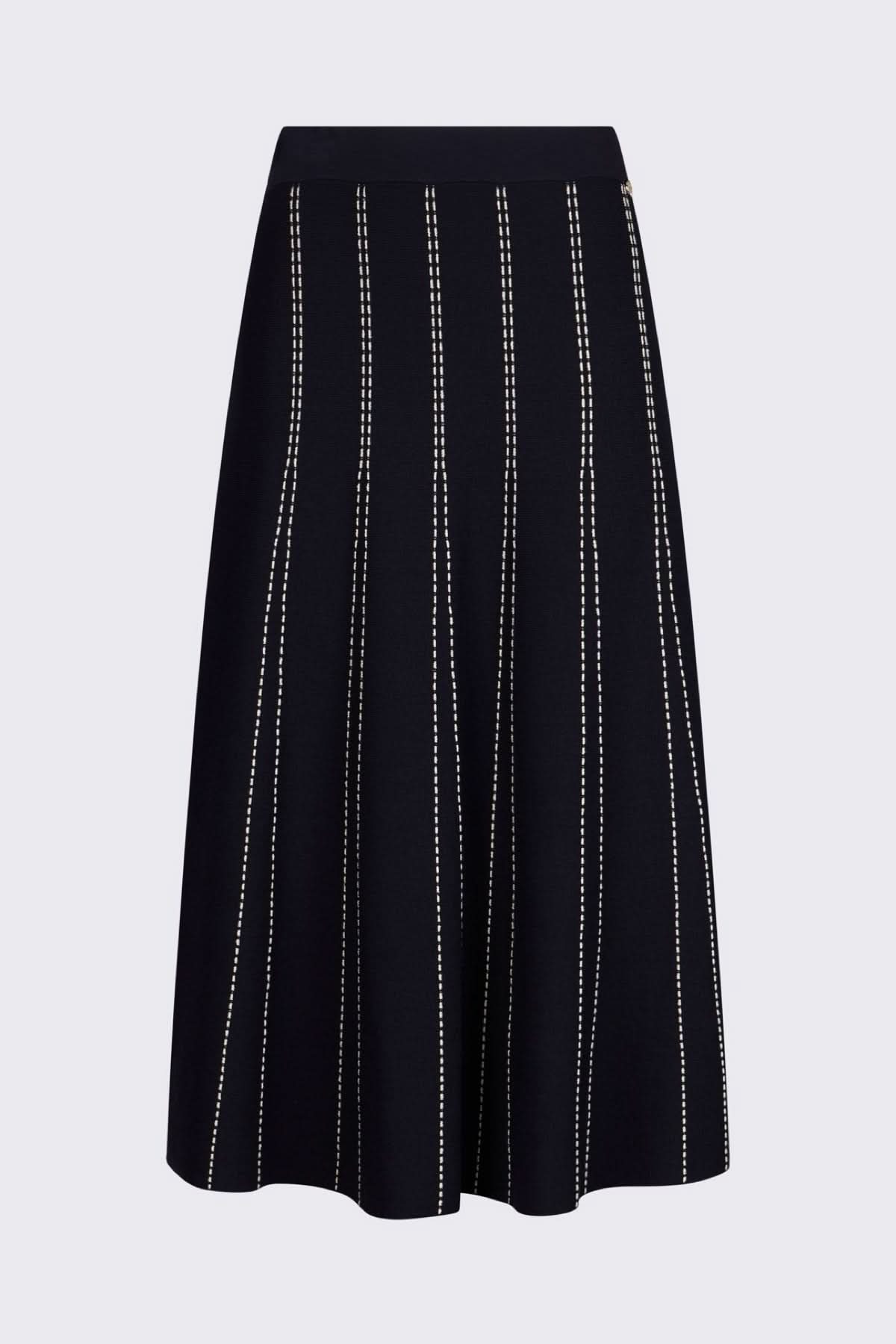 This midi skirt offers an elegant silhouette with its slightly flared cut and modern striped pattern. Its comfortable fabric flatters the figure while providing great freedom of movement. Versatile and sophisticated, it pairs just as well with a knit top as with a more dressy top.