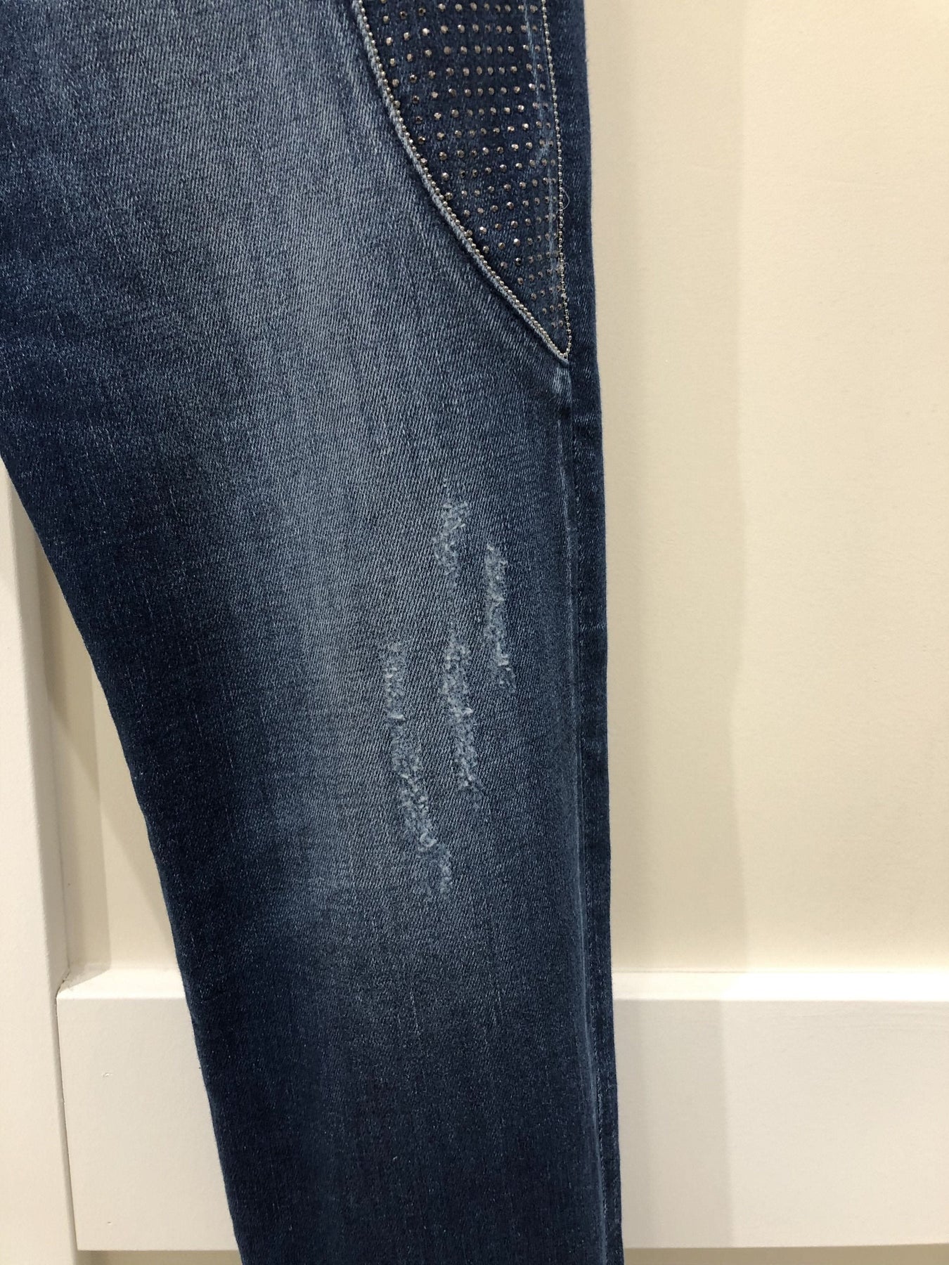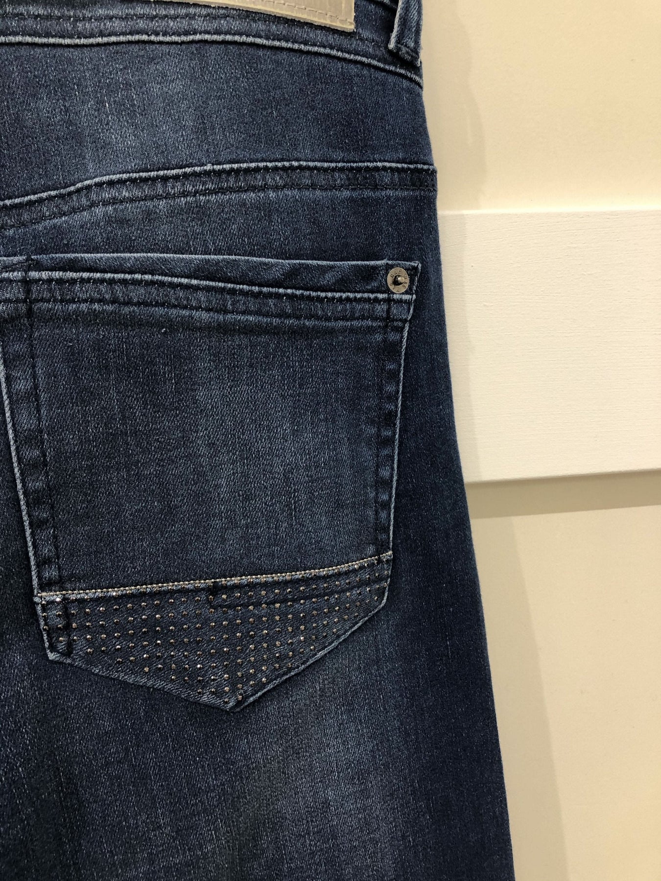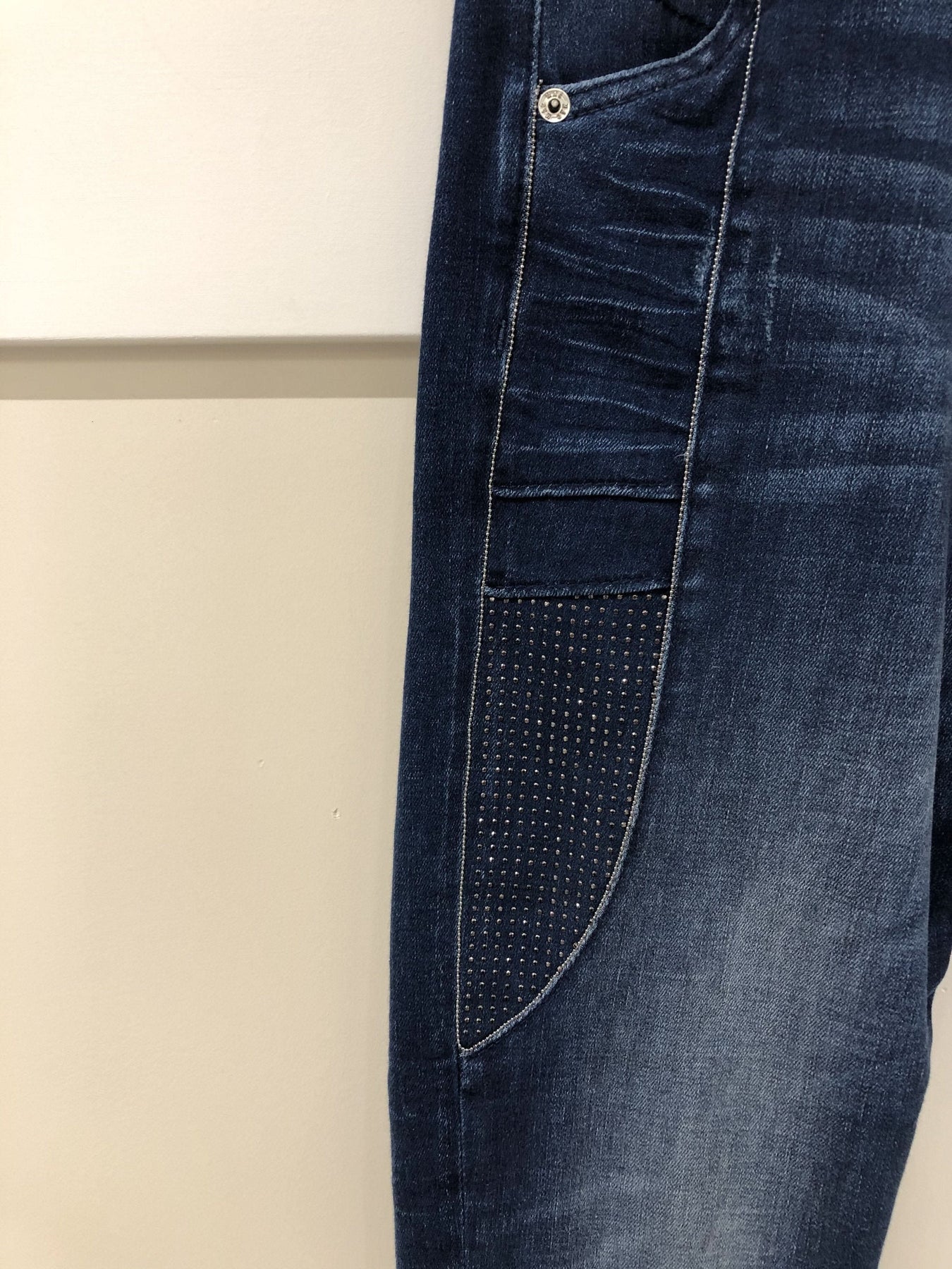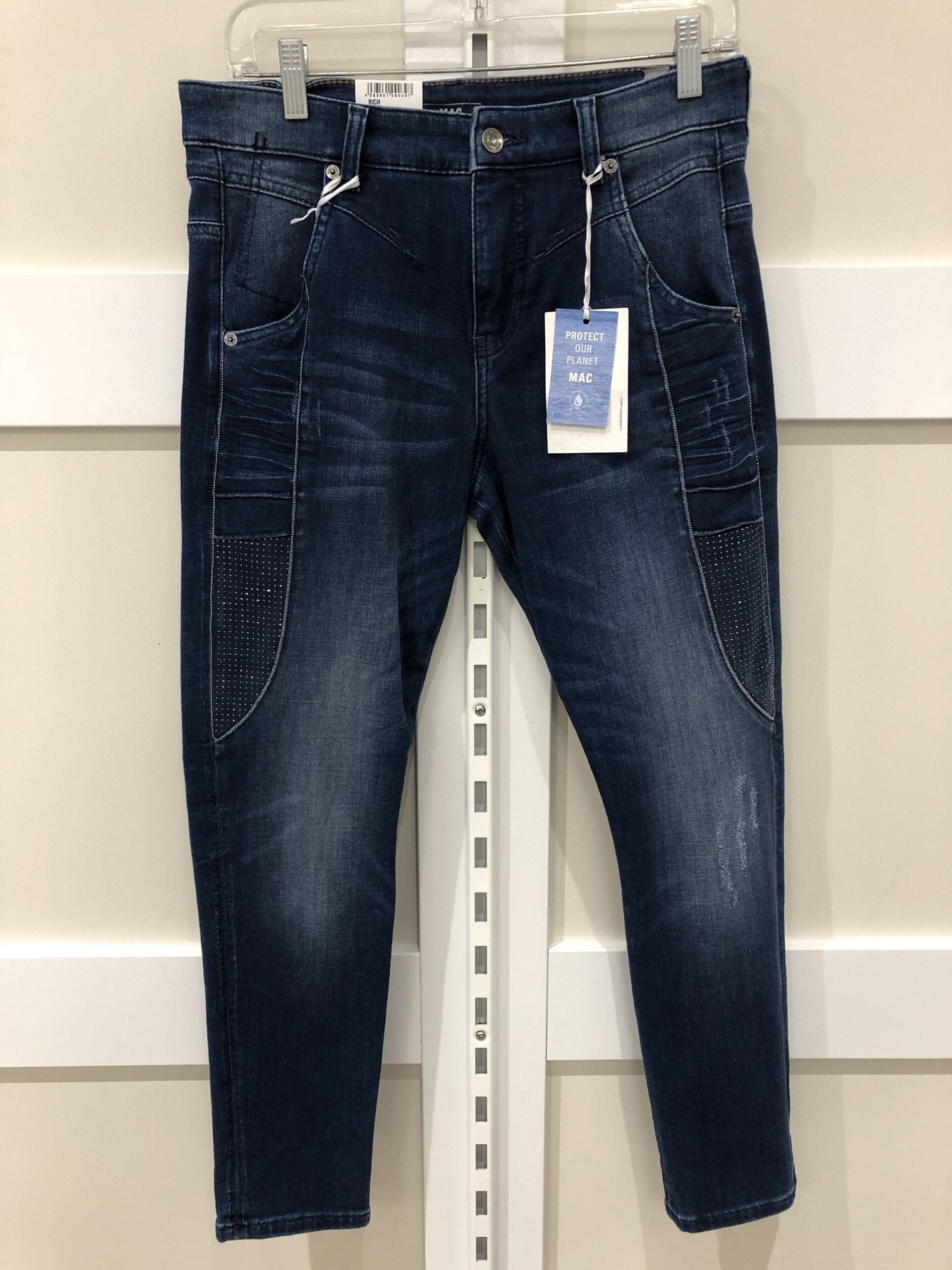 Blue washed MAC Jeans with glitter on the side of the thighs and on the back pockets. Relaxed fit. Rich model.
