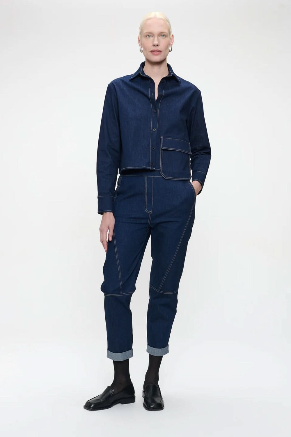 Description: Cette blouse en denim réinvente le style utilitaire avec une coupe moderne et épurée. Son grand rabat de poche à l’avant et ses surpiqûres contrastantes apportent caractère et raffinement. Conseil style : associez-la au pantalon assorti pour un total look contemporain ou portez-la avec un pantalon habillé pour un contraste élégant.