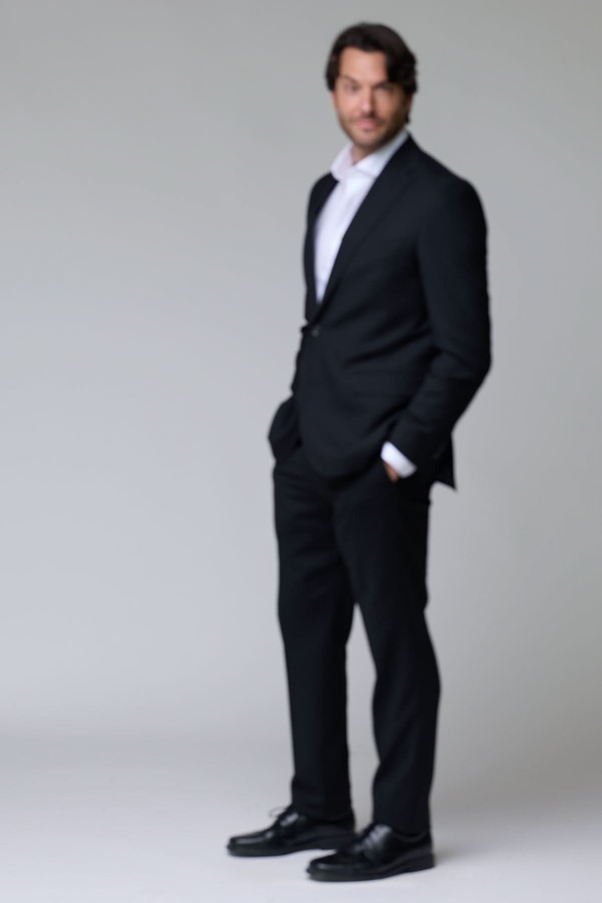 Homme en complet classique deux pièces noir, élégance intemporelle, veste à deux boutons, idéal pour occasions formelles.