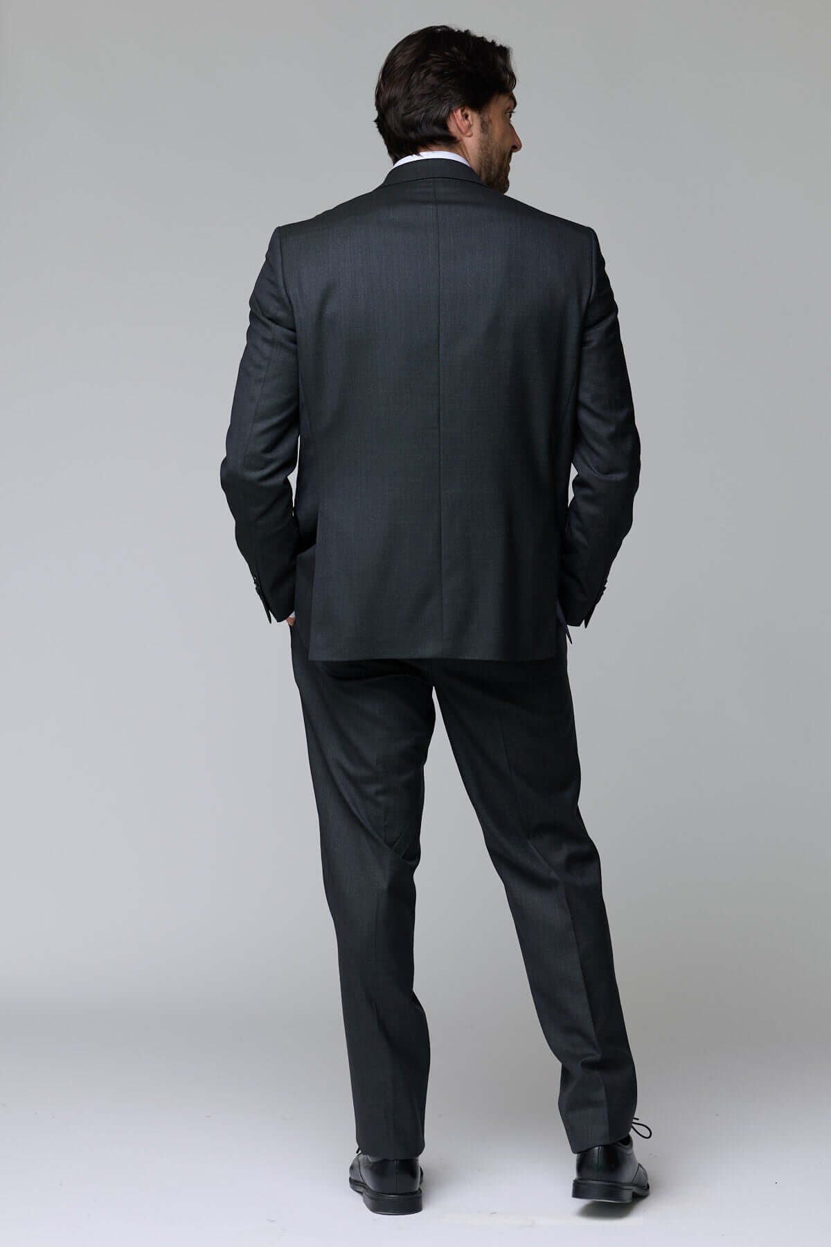 Homme portant un complet classique deux pièces en tissu structuré, vue de dos, accent sur l'élégance intemporelle et le confort optimal.