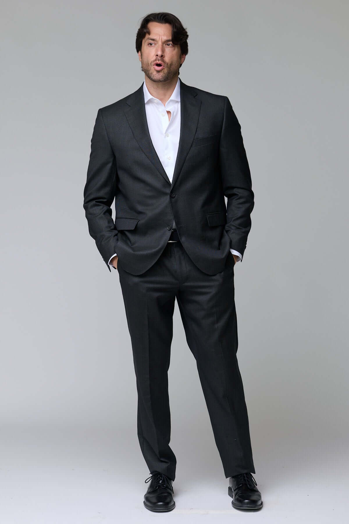 Homme portant un complet classique deux pièces en tissu structuré, soulignant la silhouette avec élégance pour les occasions formelles.