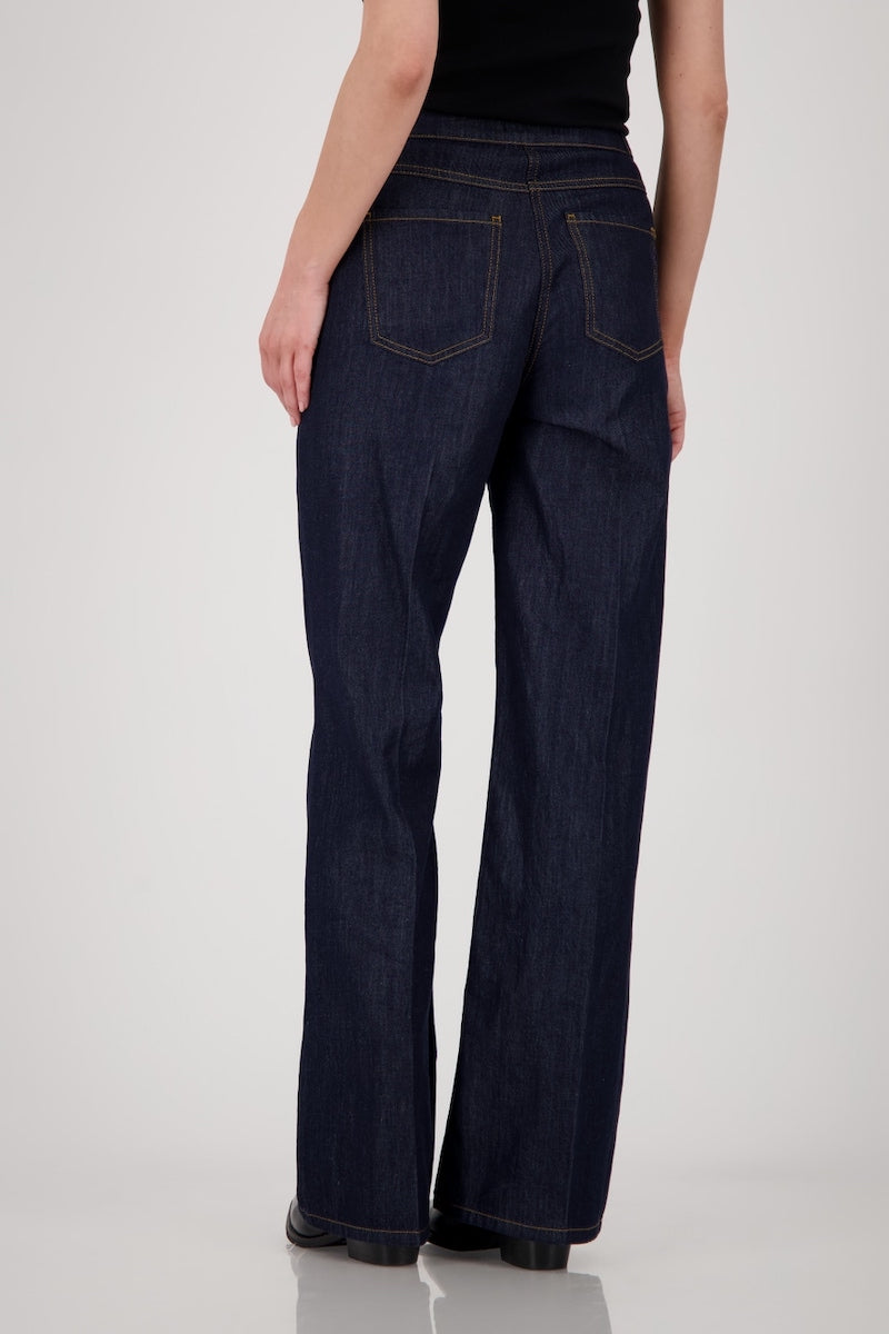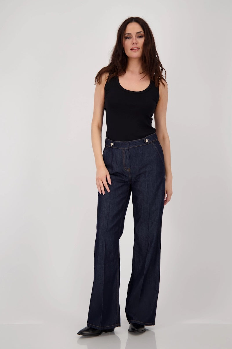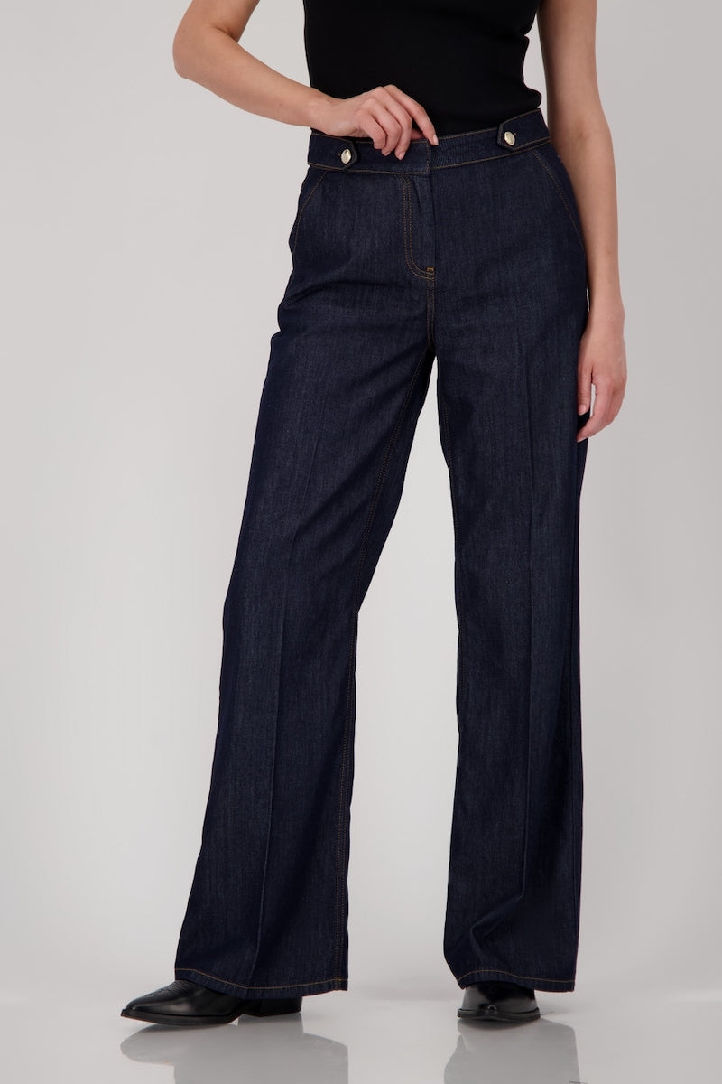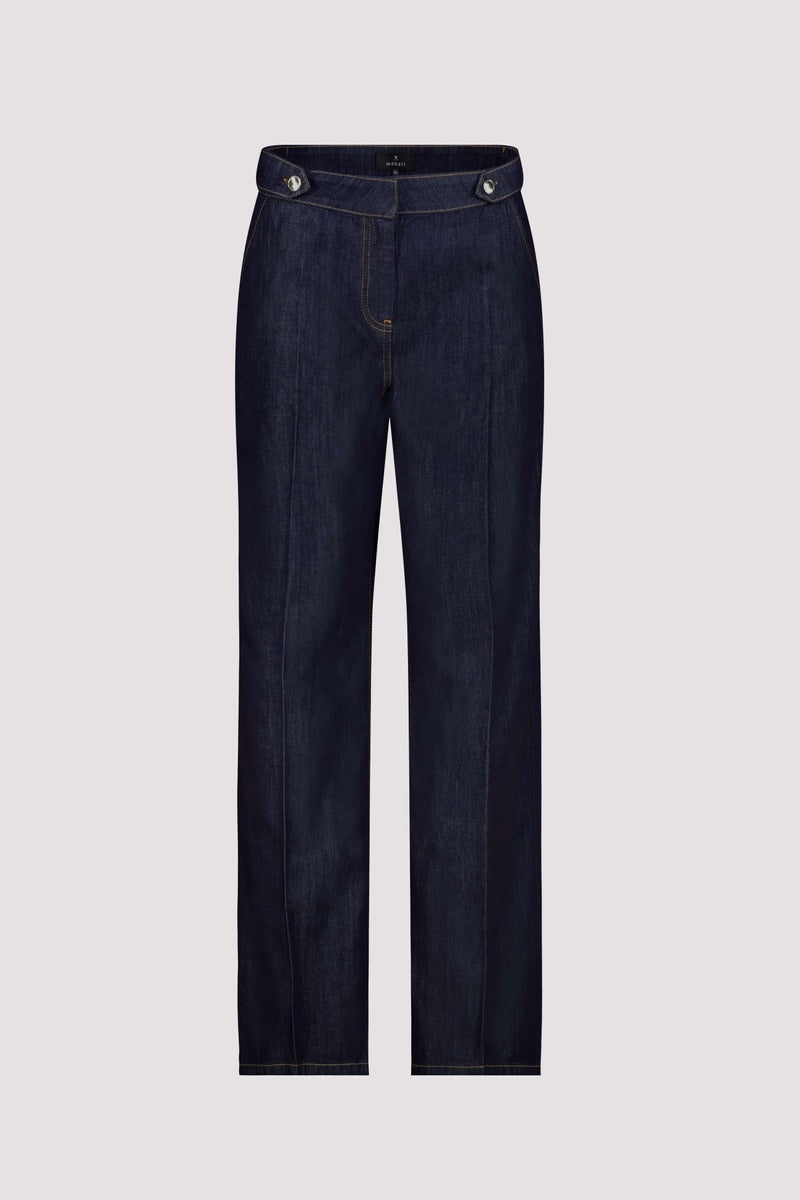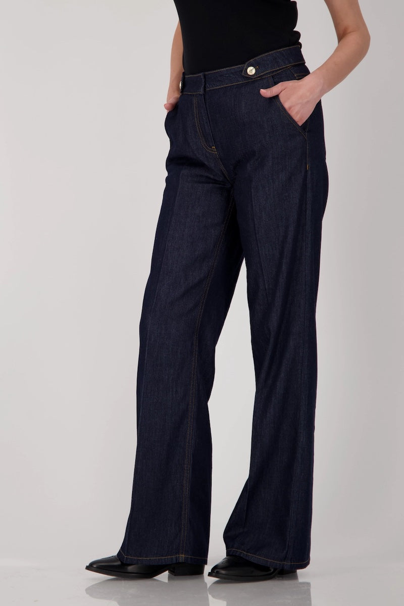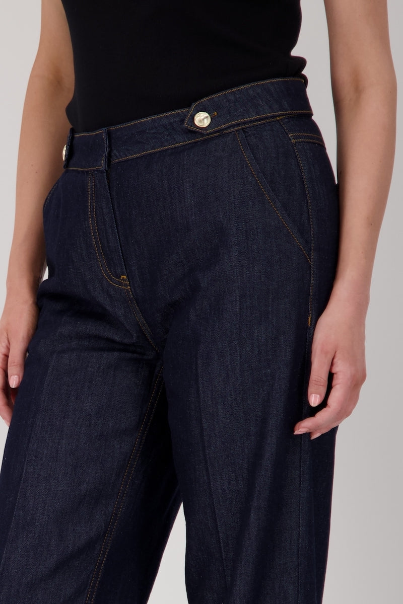Description : Jean en denim brut, taille haute avec une ceinture à passants munie de deux boutons métalliques sur le devant. Coupe droite et ample, longueur jusqu'aux chevilles. Coutures visibles ton sur ton, avec un pli marqué sur chaque jambe apportant une touche structurée à la pièce. Style à la fois élégant et décontracté, parfait pour un look moderne et confortable.