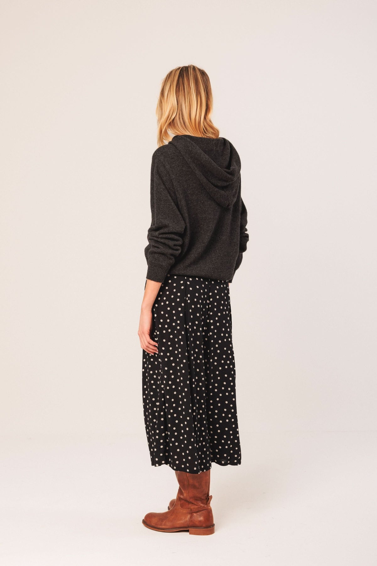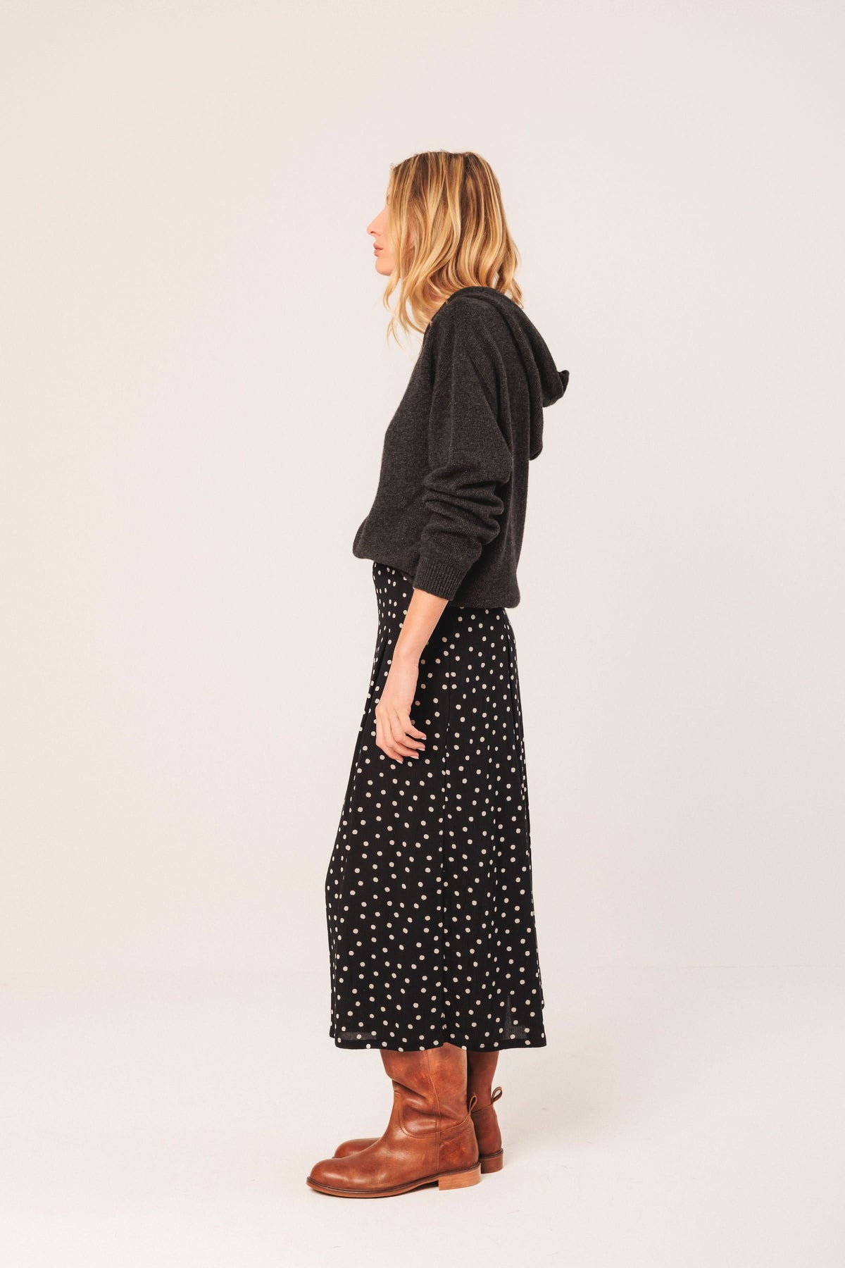 Jupe midi fluide à pois contrastés portée avec un chandail noir, offrant un look décontracté et élégant.