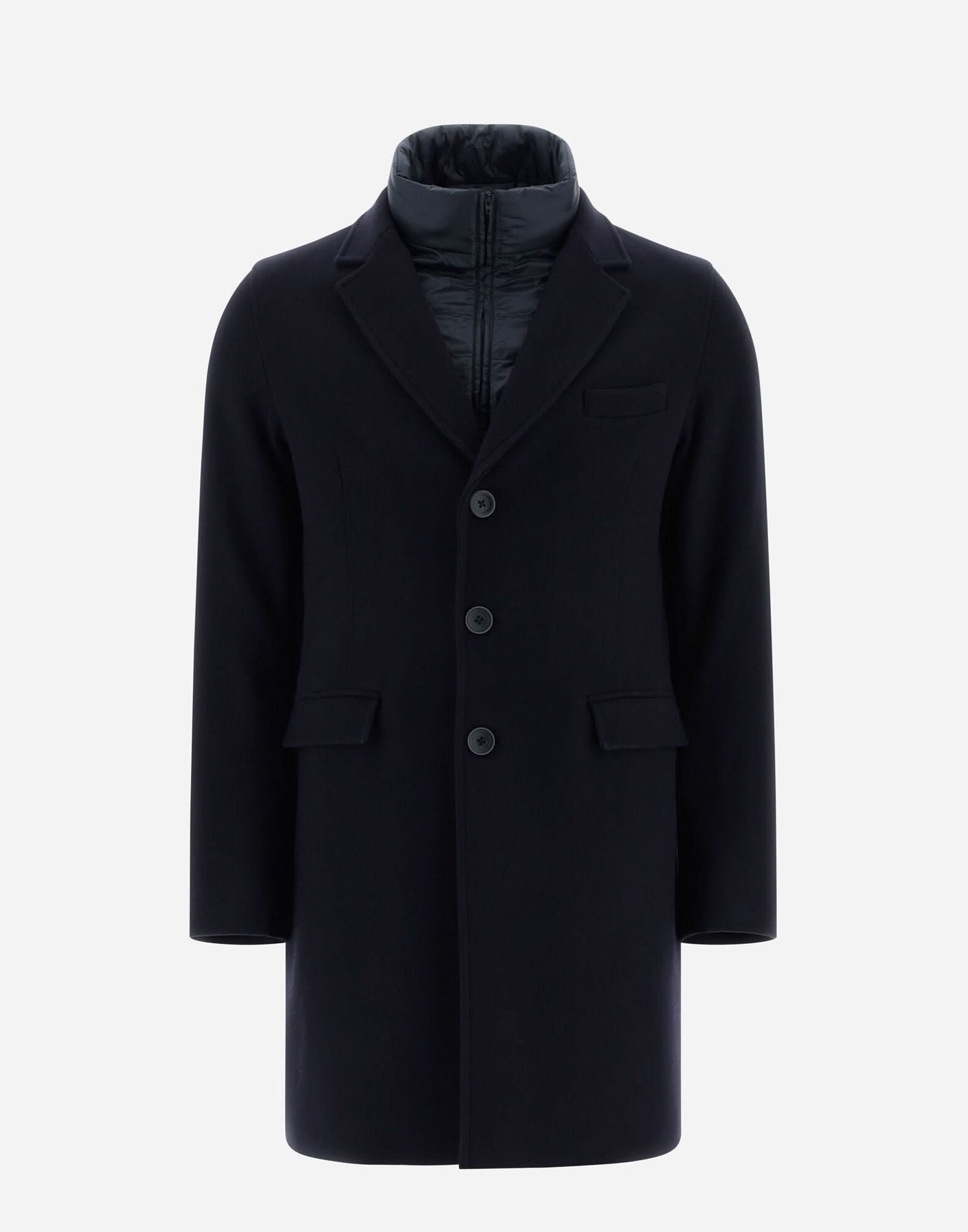 Manteau en laine Diagonal Herno, bleu, avec col matelassé et fermeture à trois boutons, coupe étroite.