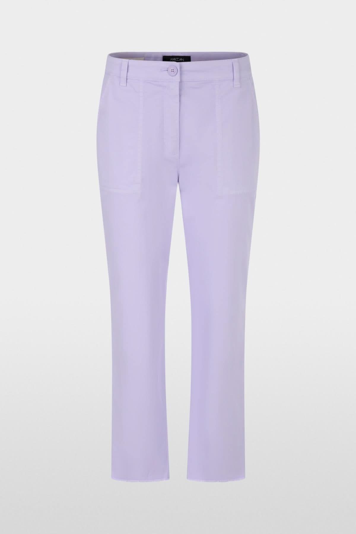 Pantalon Franca 7/8 en coton léger et stretch, couleur lilas, porté avec une veste bleue et tee-shirt stylé.