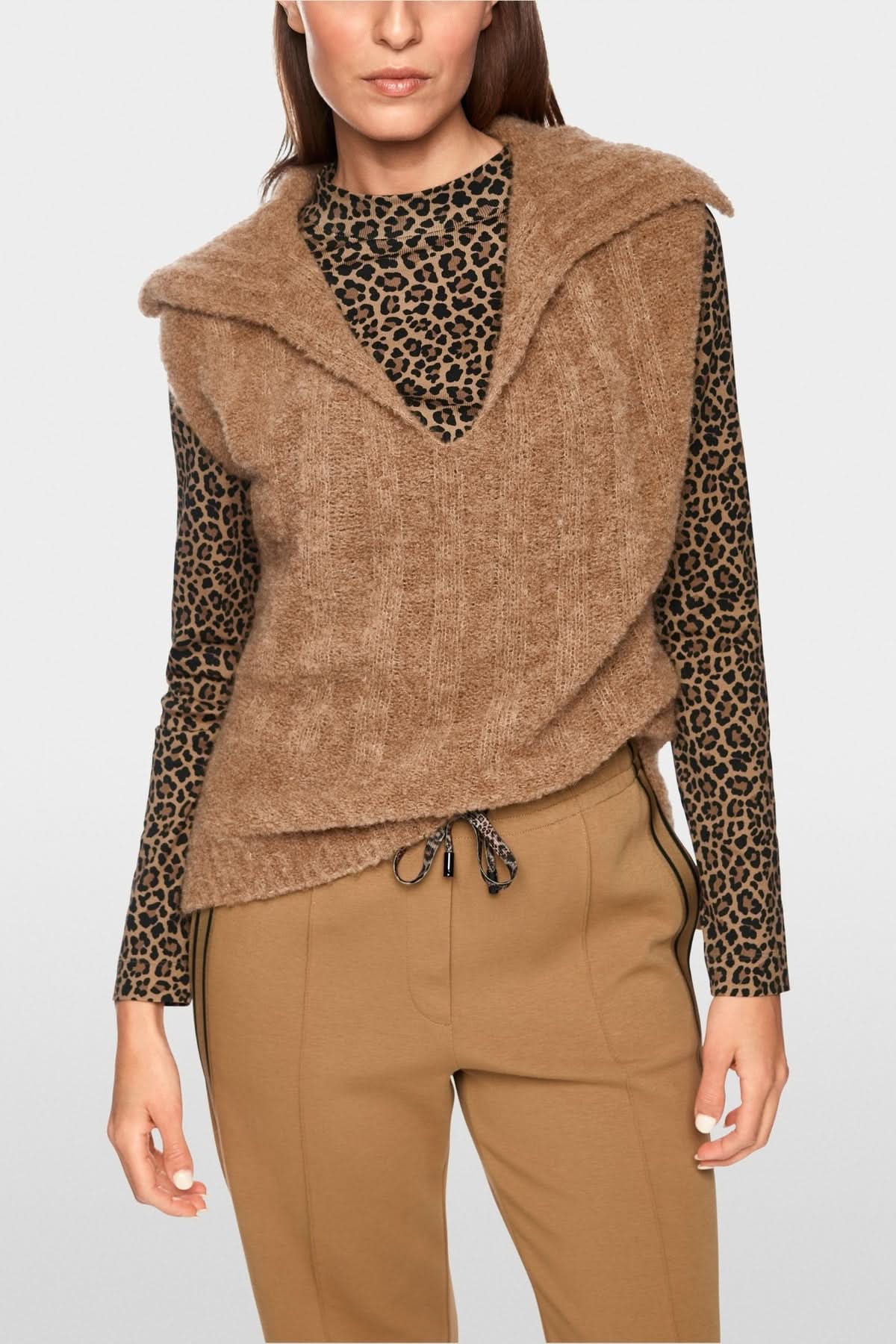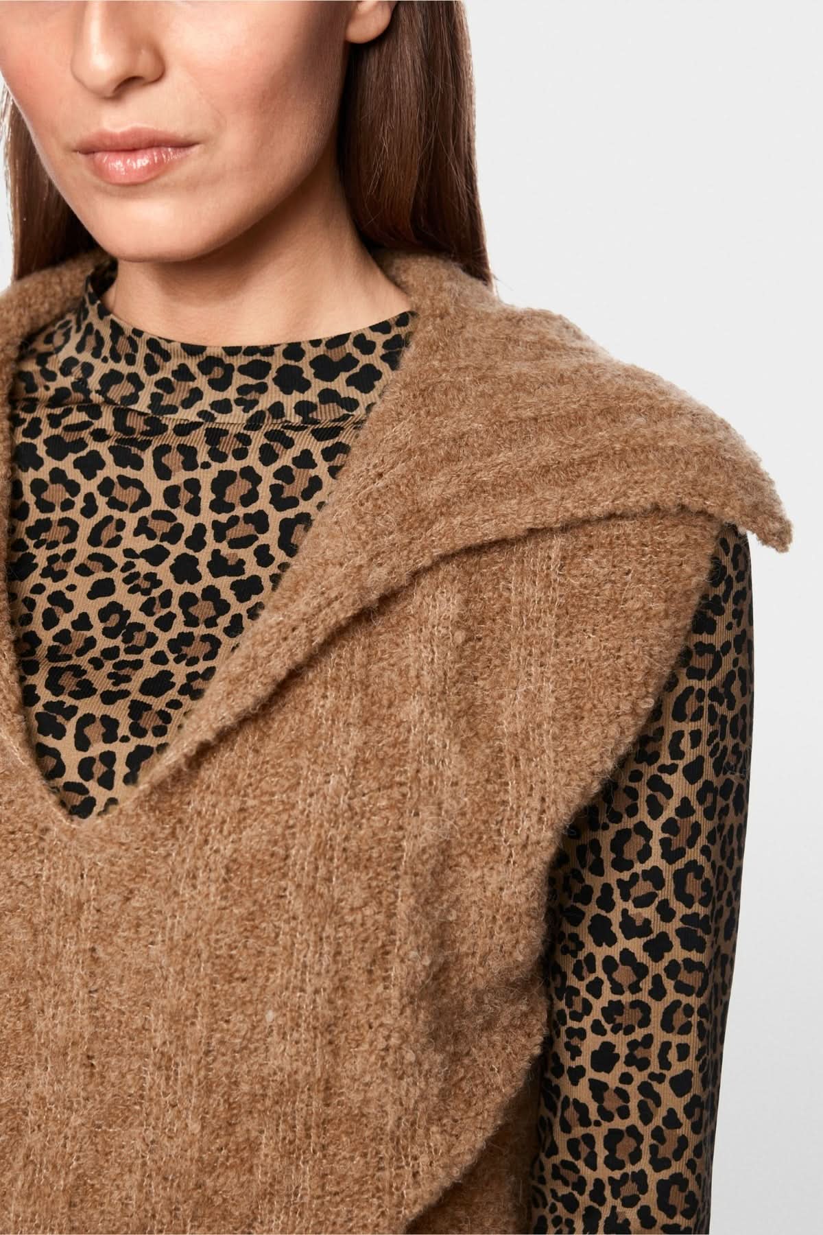 Veste sans manche tricoté, col chemise et encolure en V, portée sur un chandail léopard, texture moelleuse, coupe élégante.